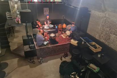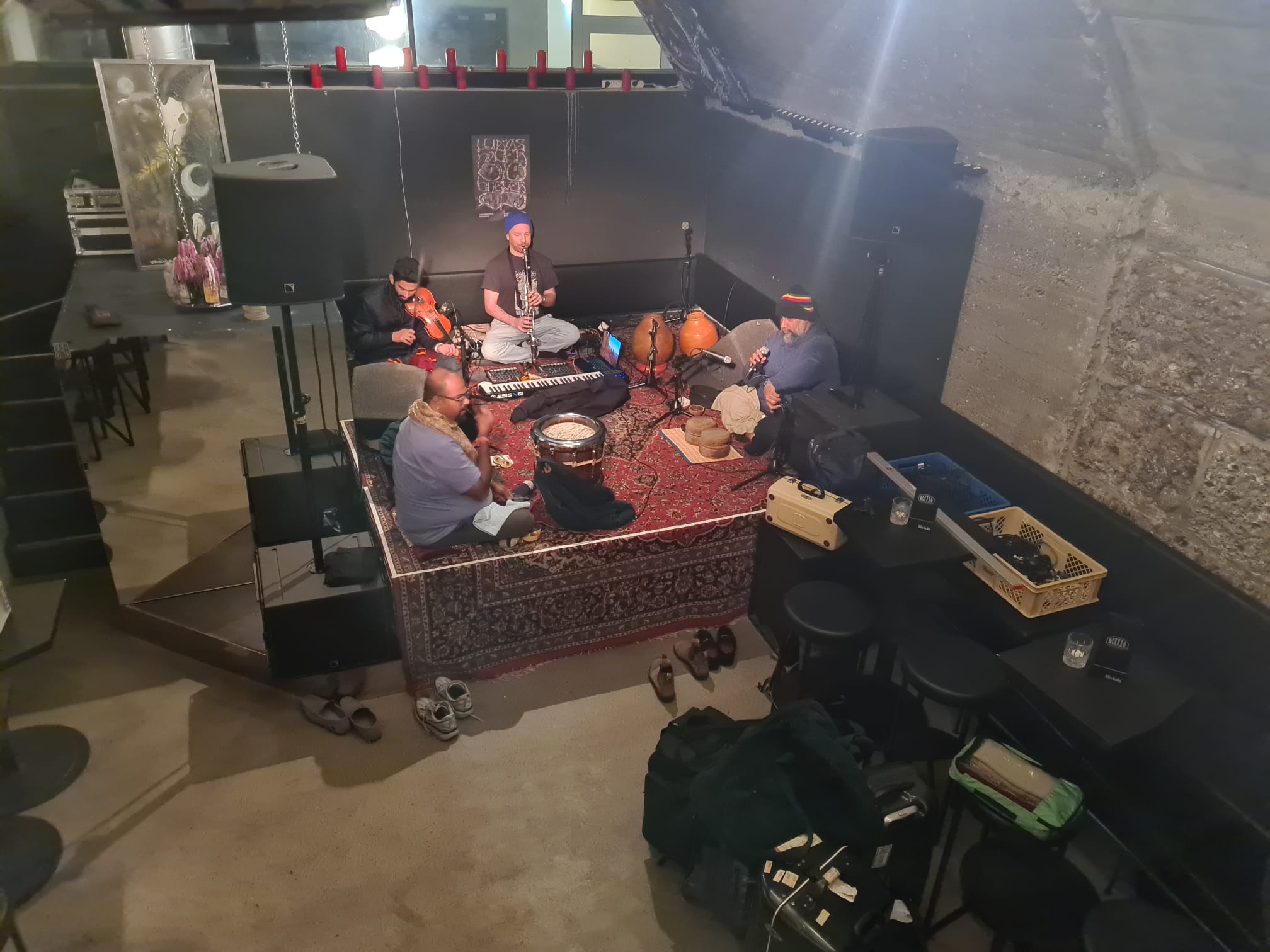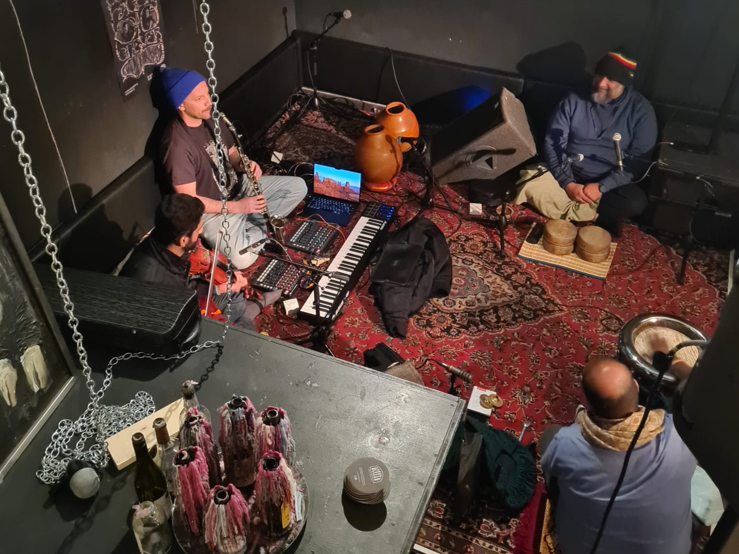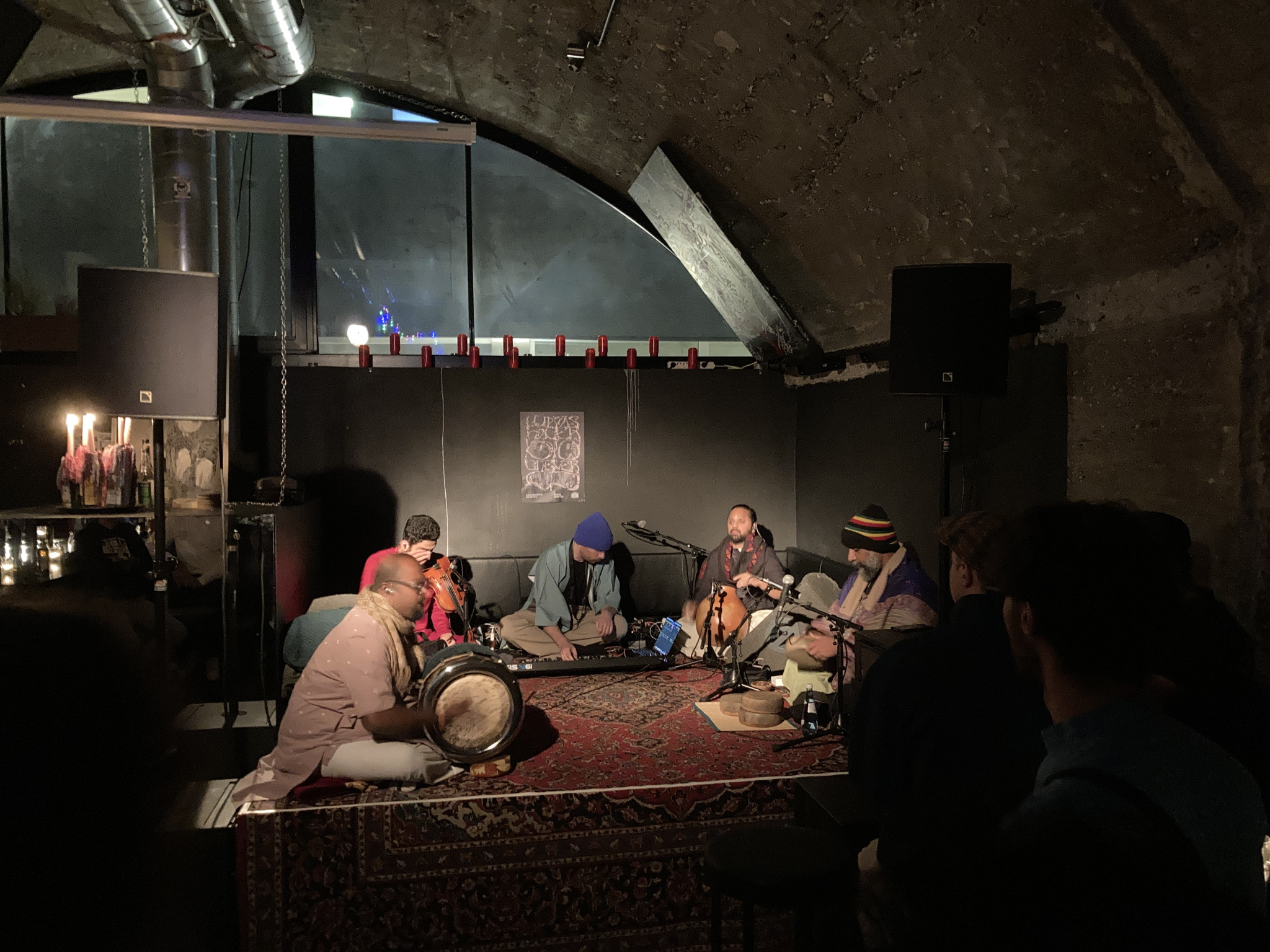 Schwerst beeindruckend war für mich mit welcher Präzision und Hingabe vor allem auch die Percussions und rhythmusgebenden Instrumente, Töpfe und Objekte eingesetzt wurden. Tranceartige Spoken Word Elemente waren genauso dabei wie taktgebende anfeuerndes Singen. Es hatte was von Magie, dazu trug sicher auch bei, dass die fünf Protagonisten allesamt am Boden auf ihren Kissen saßen und sich dem Konzert vollends hingaben.